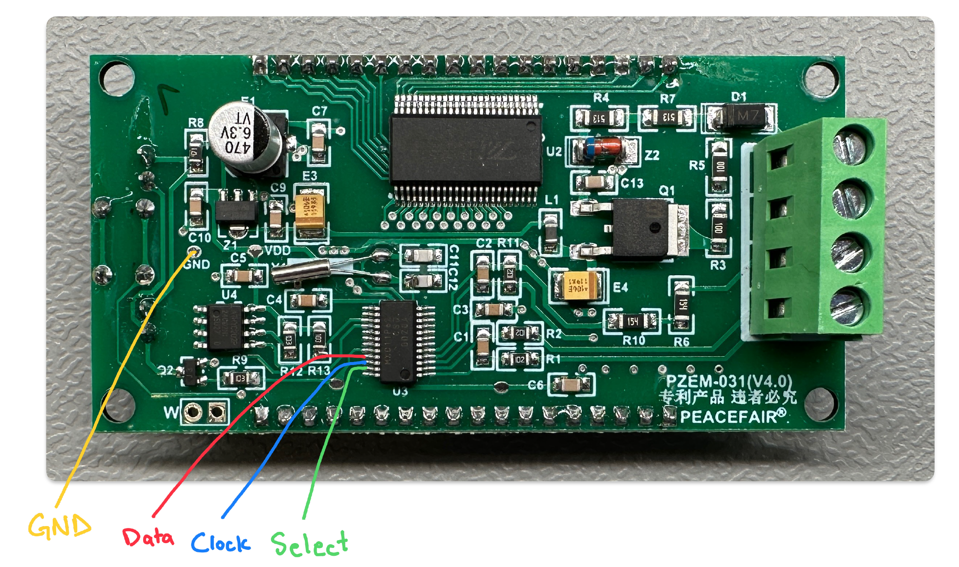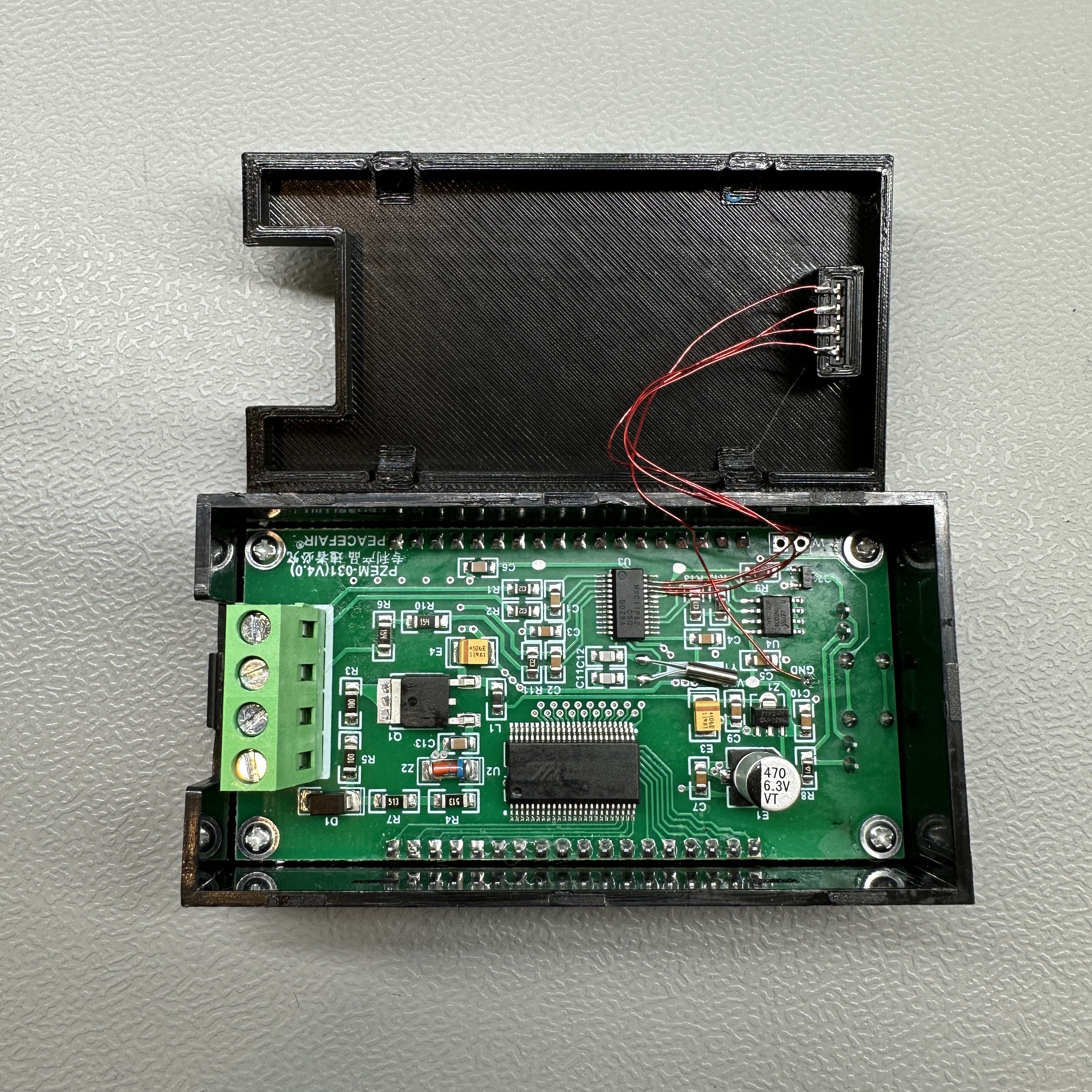 Unfortunately, on the PZEM-031 (V4.0) that I was modifying, there were no easy locations to access the data signals, so I had to solder thin wires to the fine pitch microcontroller leads. I later learned that on the PZEM-051 (V5.0), there are easy to access test points that the wires can be soldered to.